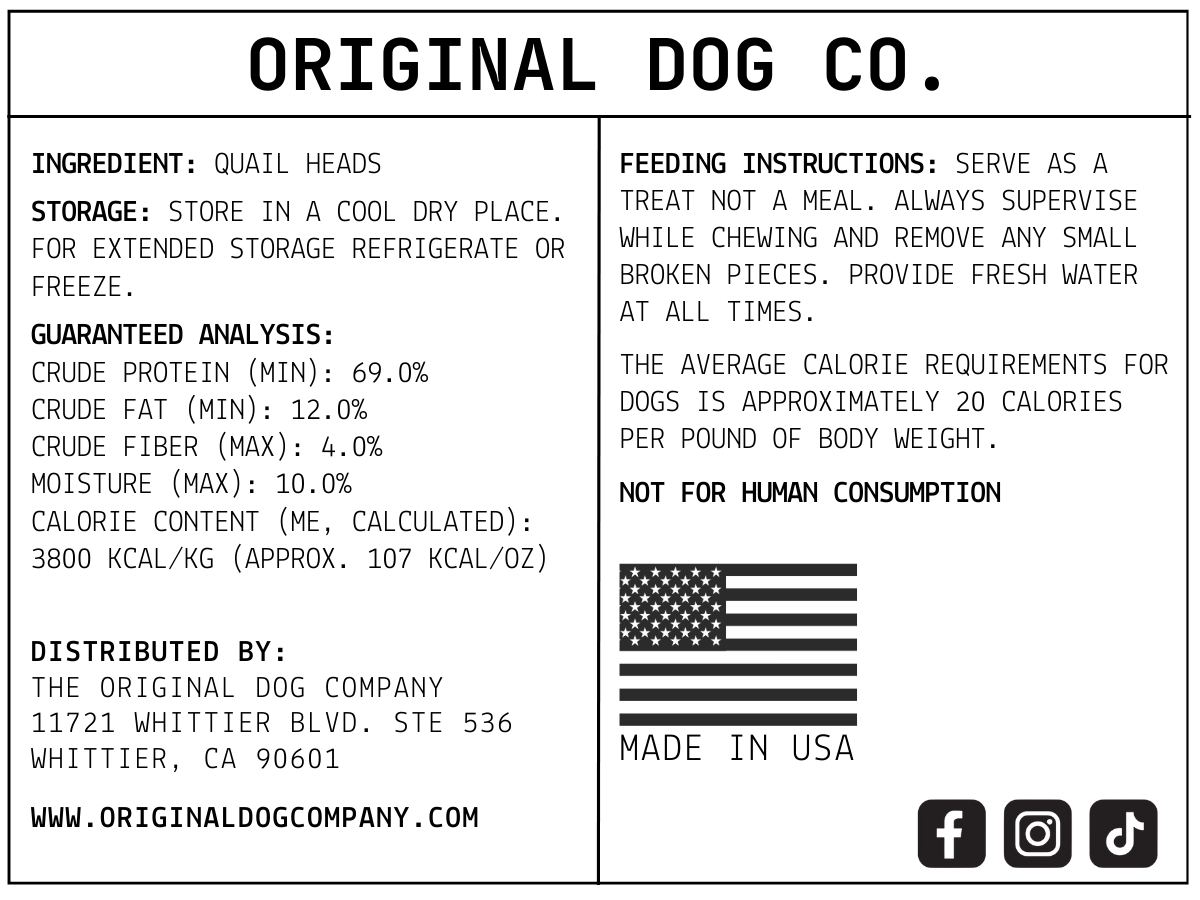 Our freeze dried quail heads are a clean, single-ingredient treat made for dogs who enjoy natural chewing and enrichment. Gently freeze dried to preserve nutrients, texture, and flavor, these crunchy bites offer a novel protein option while supporting dental health and mental stimulation. It’s a simple way to add variety and whole-prey style treats to your dog’s routine.